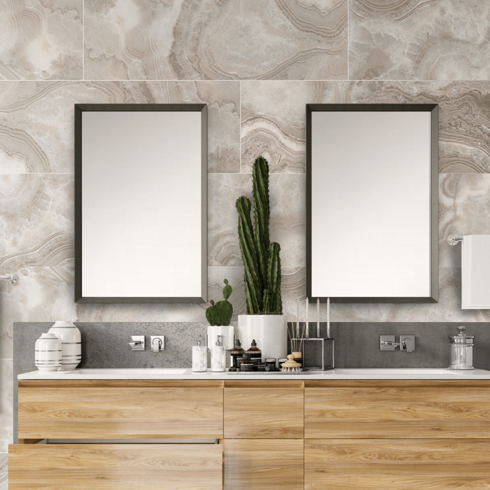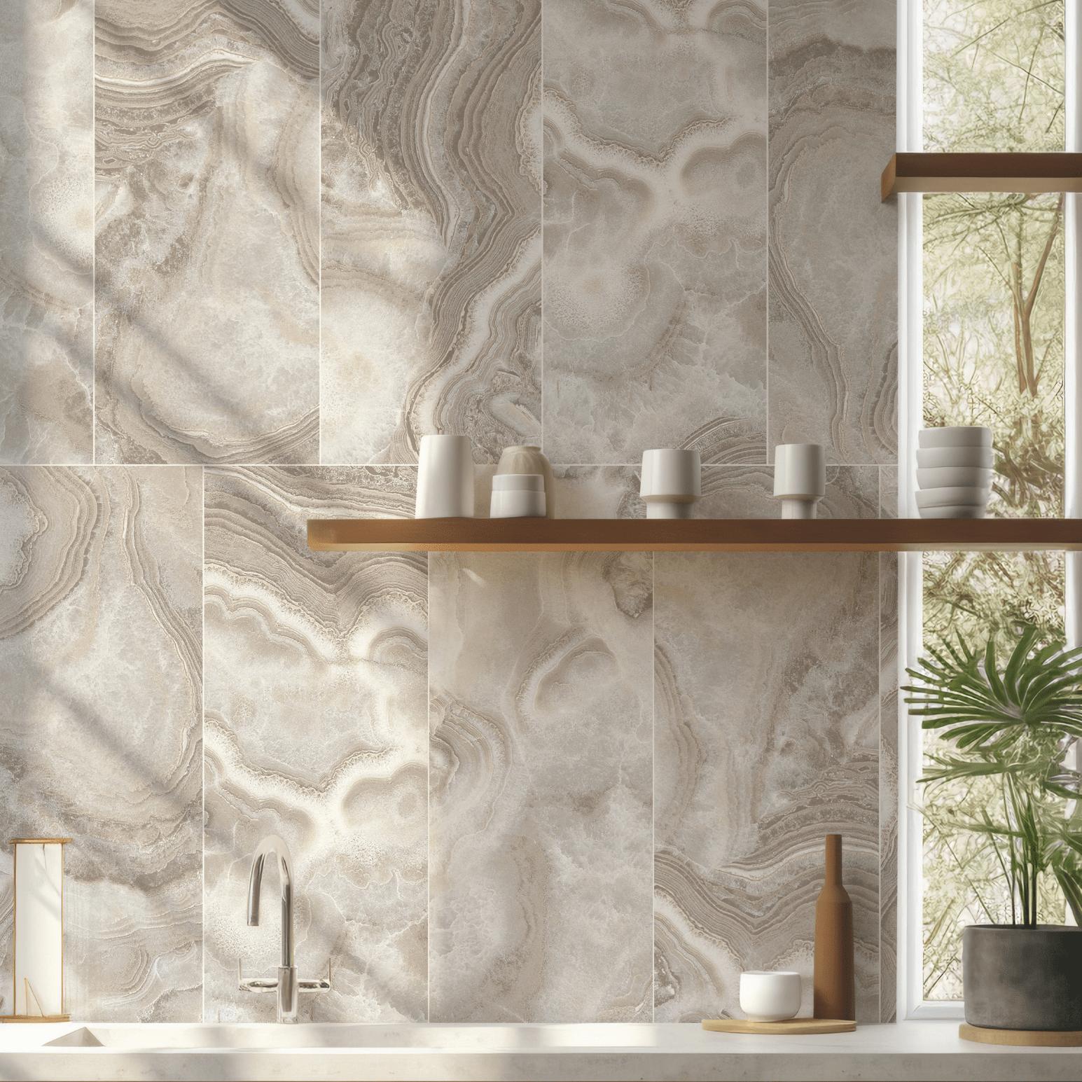 Infuse a room with a touch of flair using this replicated? cream onyx tile with a touch of real gold. Its plank shape adds a striking and unique element.?