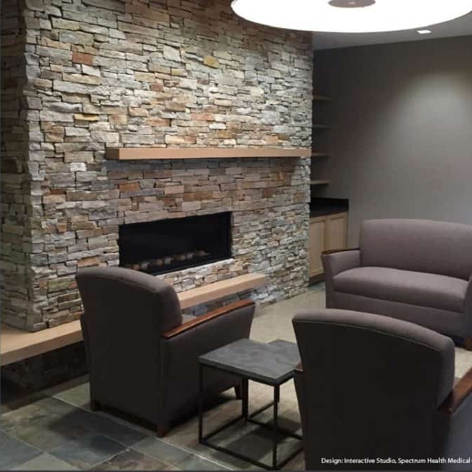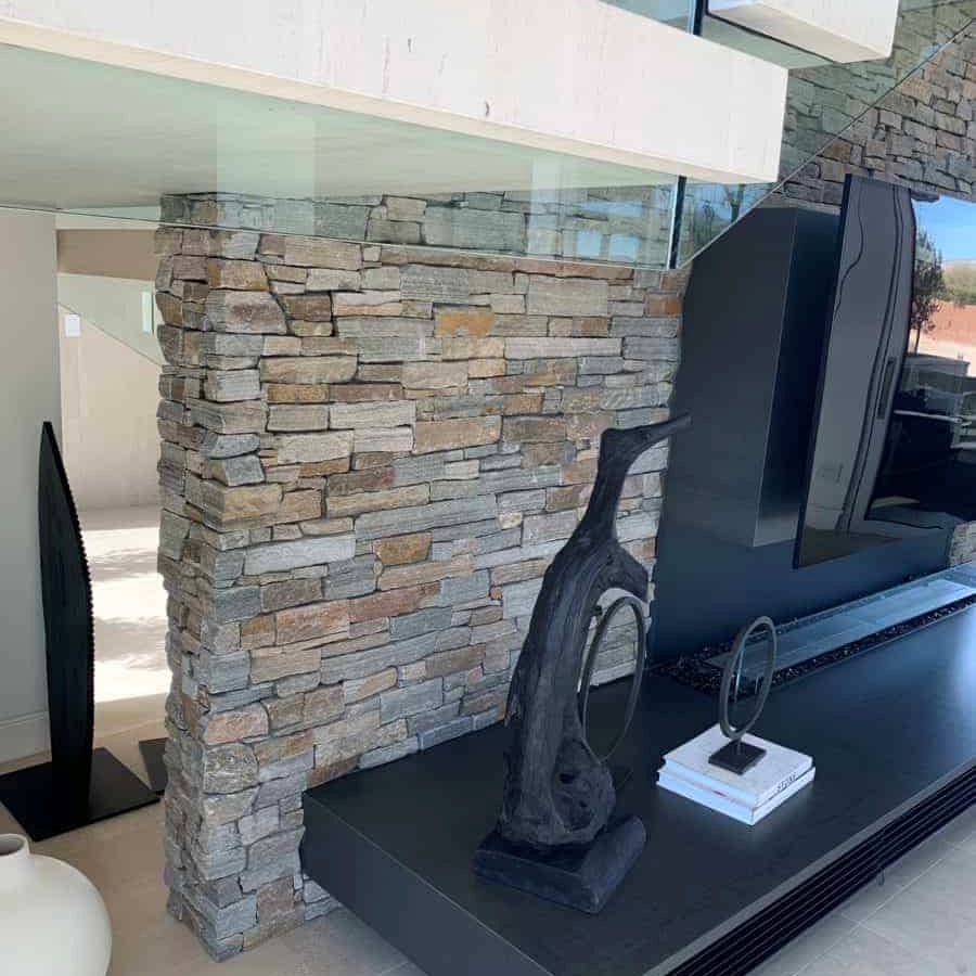 The Estate collection consists of metal mesh backed panels of natural stone, random placement, 4 colors. Shown here in Greystone Gold Panel.